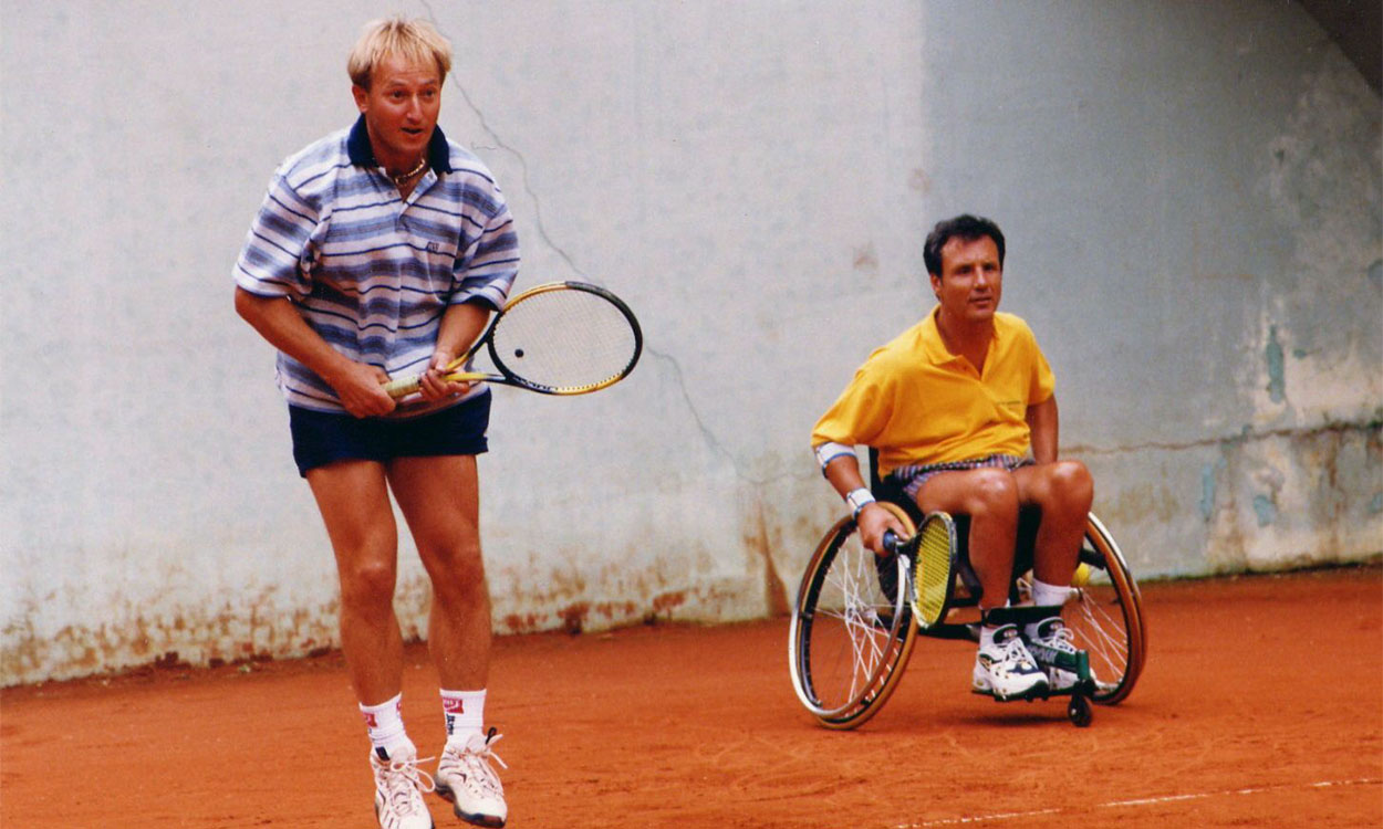 Začetki tenisa na invalidskih vozičkih segajo v šestdeseta leta prejšnjega stoletja. Začelo se je (kot mnogo drugih stvari) v Ameriki. No, v Evropi so začeli invalidi tenis igrati v sedemdesetih letih, pri nas v Sloveniji pa v devetdesetih. Najprej so se v tej, nekoliko bolj zahtevni igri, poizkusili gorenjski paraplegiki, prvo turnirsko zmago pa smo zabeležili v Pragi leta 1997. V dvojicah sta jo dosegla Zdravko Eržen in Slavko Bračič