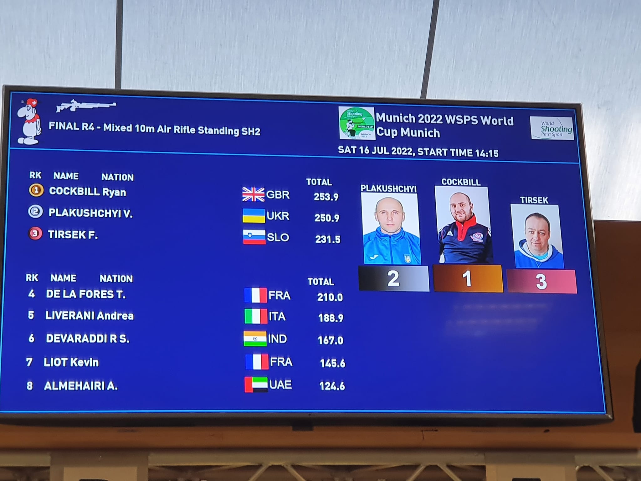 V nadaljevanju tekmovanja je Franček G, Tiršek osvojil 3. mesto (231,5), drugi je bil V. Plakuschyi (250,9) UKR, prvi pa Ryan Cockbill (253,9) GBR.