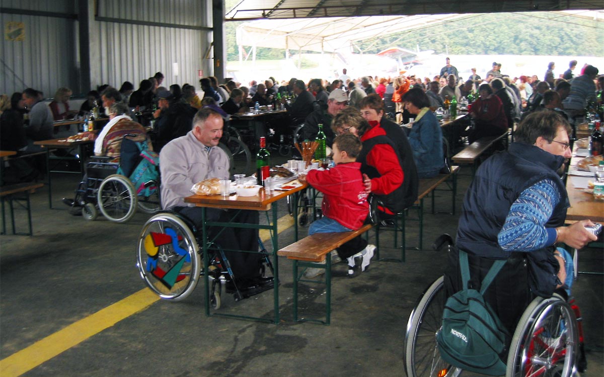 Srečanje smo nadaljevali na bližnjem športnem letališču v Šentvidu pri Stični, kjer so nam domačini v zavetju hangarja in v ta namen postavljenega šotora pripravili obsežen kulturni program. Predstavili so se nam šentviški pevci, ki so nosilci tabora slovenskih pevskih zborov, plesalci iz skupine Vidovo, predstavnika turističnega društva pa sta orisala zgodovino kraja skozi čas. Zgodovino Zveze paraplegikov skozi petintridesetletno obdobje je predstavil predsednik Zveze Ivan Peršak, pozdravil pa nas je tudi takratni župan občine Ivančna Gorica Jernej Lampret.